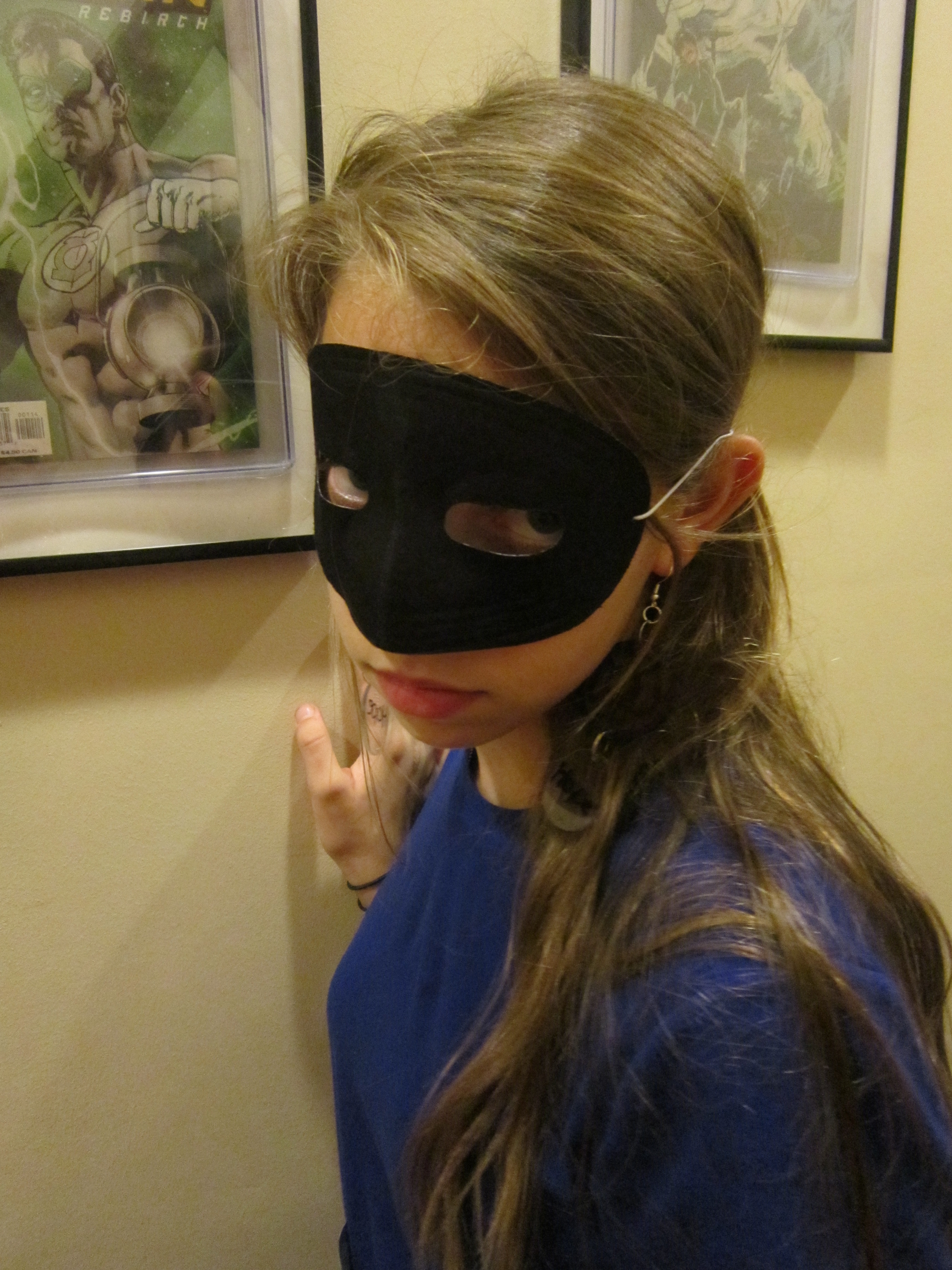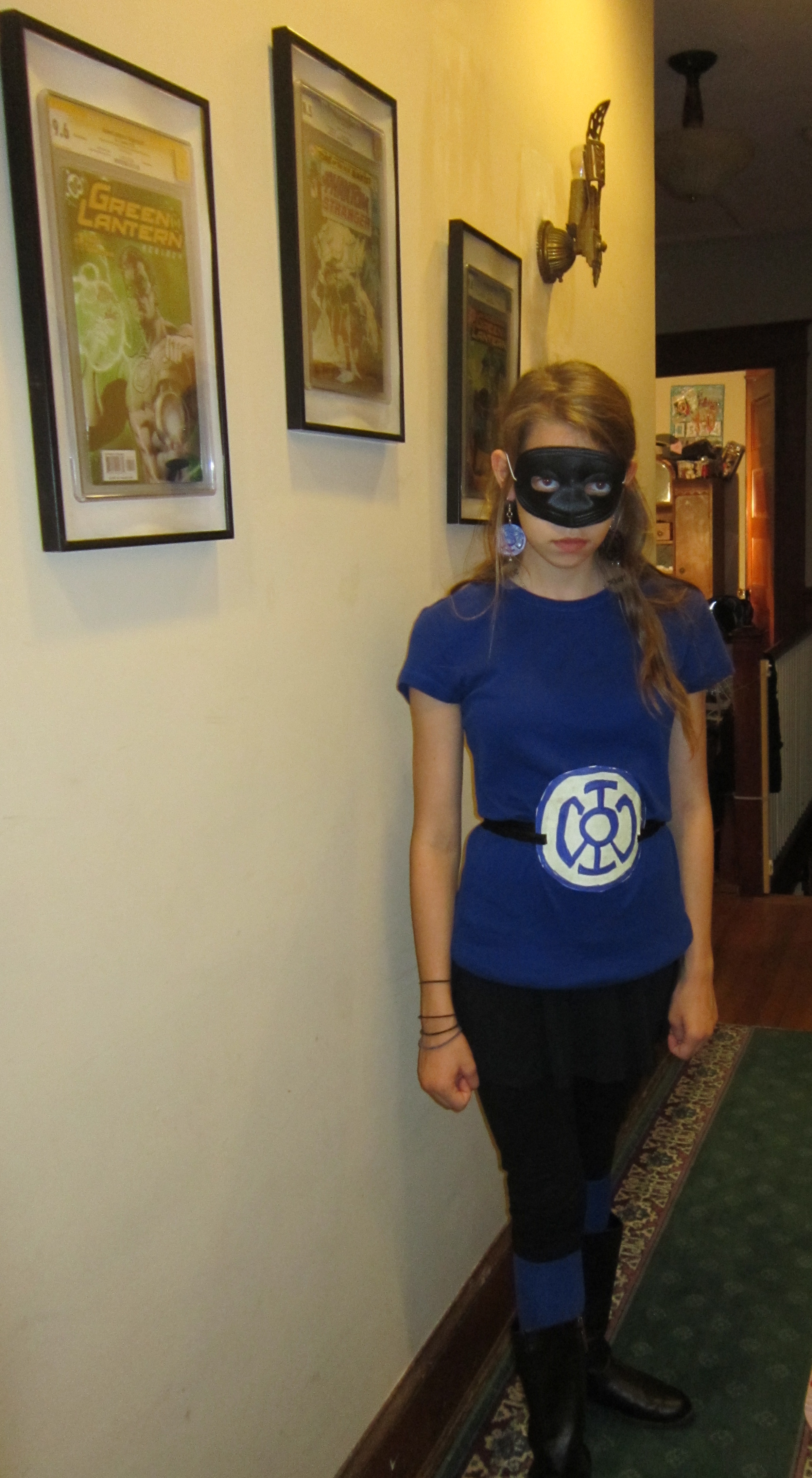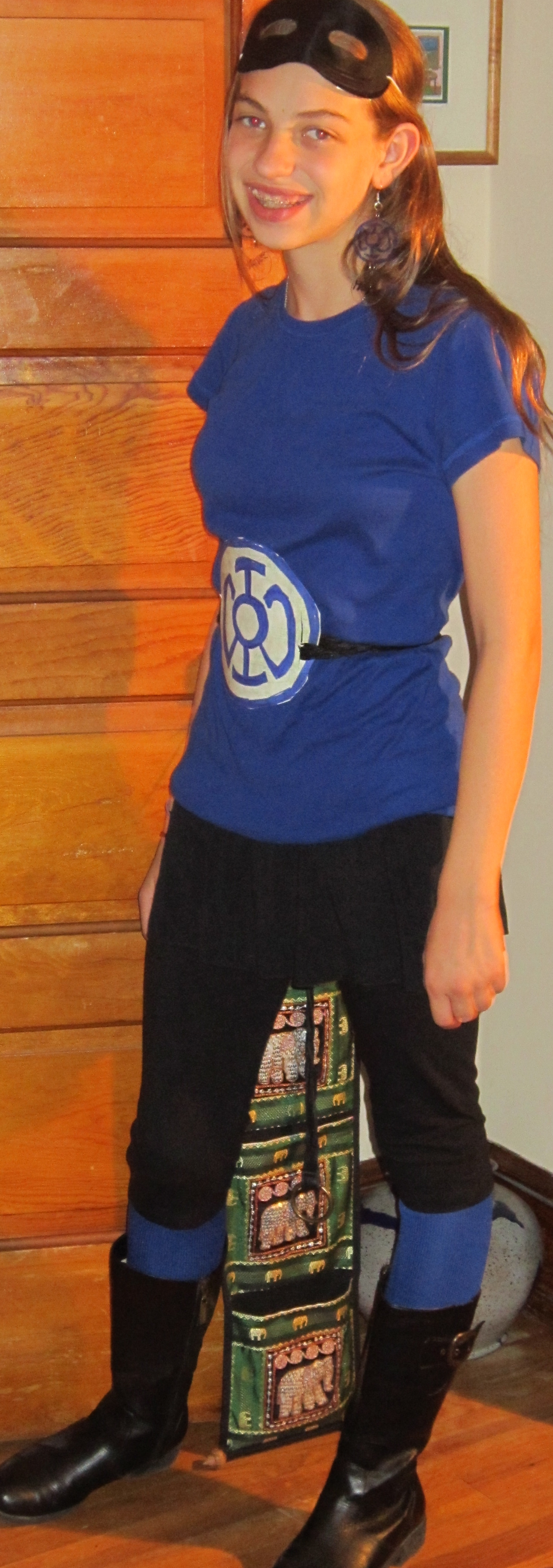 all heard it it, “Mom/Dad, I need a superhero costume for spirit day tomorrow.”  In a house filled with craft supplies, dress up clothes and a fashion conscious twelve year old, that really isn’t as panic inducing as it would have been a few years back.  We are big Green Lantern fans (well, my husband is and it rubs off over time), so I vaguely knew that there were other lanterns out there, guardians of the emotional spectrum.  Rebecca decided to be a “Blue Lantern,” created after the Guardians kicked out two unique individuals who couldn’t toe the line.  These guys chose “hope” as their motto, so my daughter thought they would be an inspiring selection.   How do you make a super hero costume for 93 degree weather and no spandex in sight?  Read on.