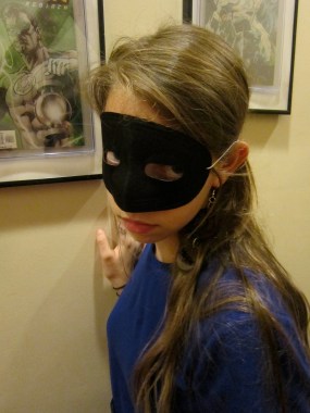 2.   Make a medallion.  Superheroes are nothing without their medallion but we didn’t want to mess up her new shirt and we needed something to keep the blue/black theme going.   A piece of  heavy craft paper with Blue Lantern’s symbol drawn on with Sharpie was quick.  Snip a slit on each side and slide a length of black fabric through and you have a medallion and belt in one.