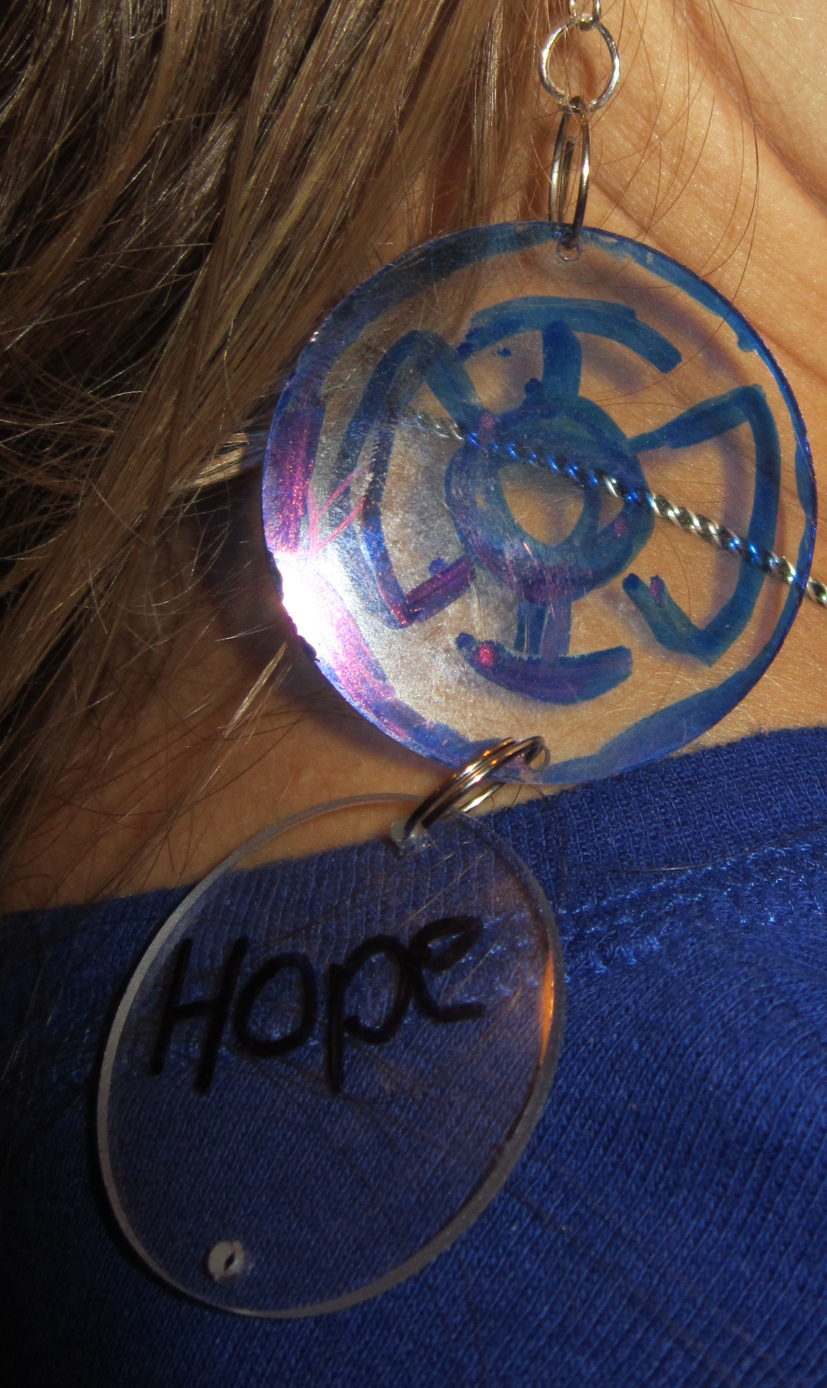 3.  Add a personal touch. In this case, we made blue lantern earrings to give  the costume some extra pizzaz.  I have lots of jewelry supplies, so whipping up earrings isn’t a problem , but you could put mini paper medallions over existing earrings.  If you happen to have funky plastic Christmas discs (as do I), draw that medallion symbol again.  Rebecca added “hope” to each one.  A nice touch, huh?