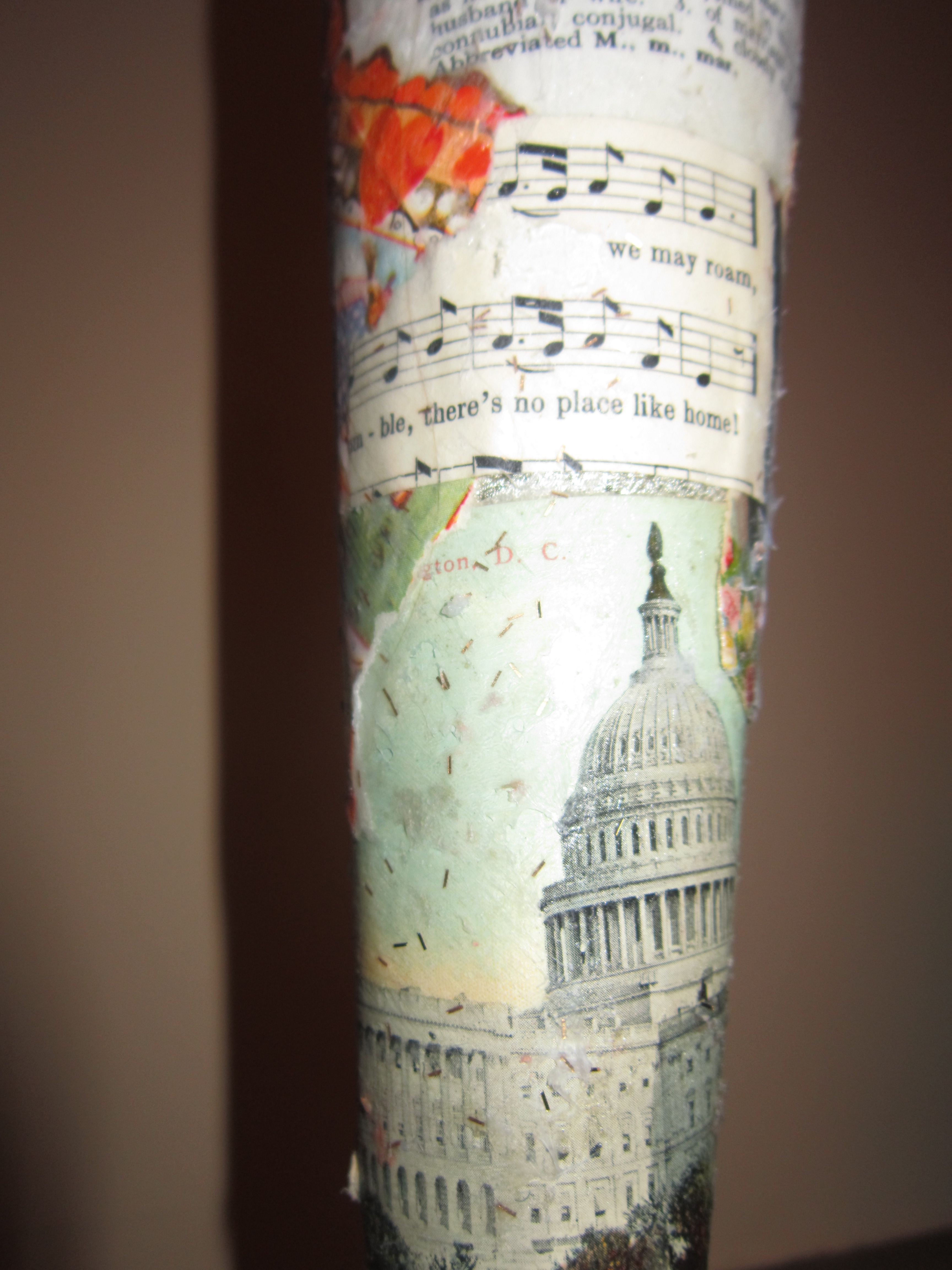The main column combines a lot of fun things–real valentines and a definition of marriage from the dictionary, a vintage DC postcard, and other scraps that have significance for us. I coated it with several layers of mod podge, added a resin gem I picked up at a flea market, and put a tiny 15 on the gem, cut from an old Monopoly “Chance” card.